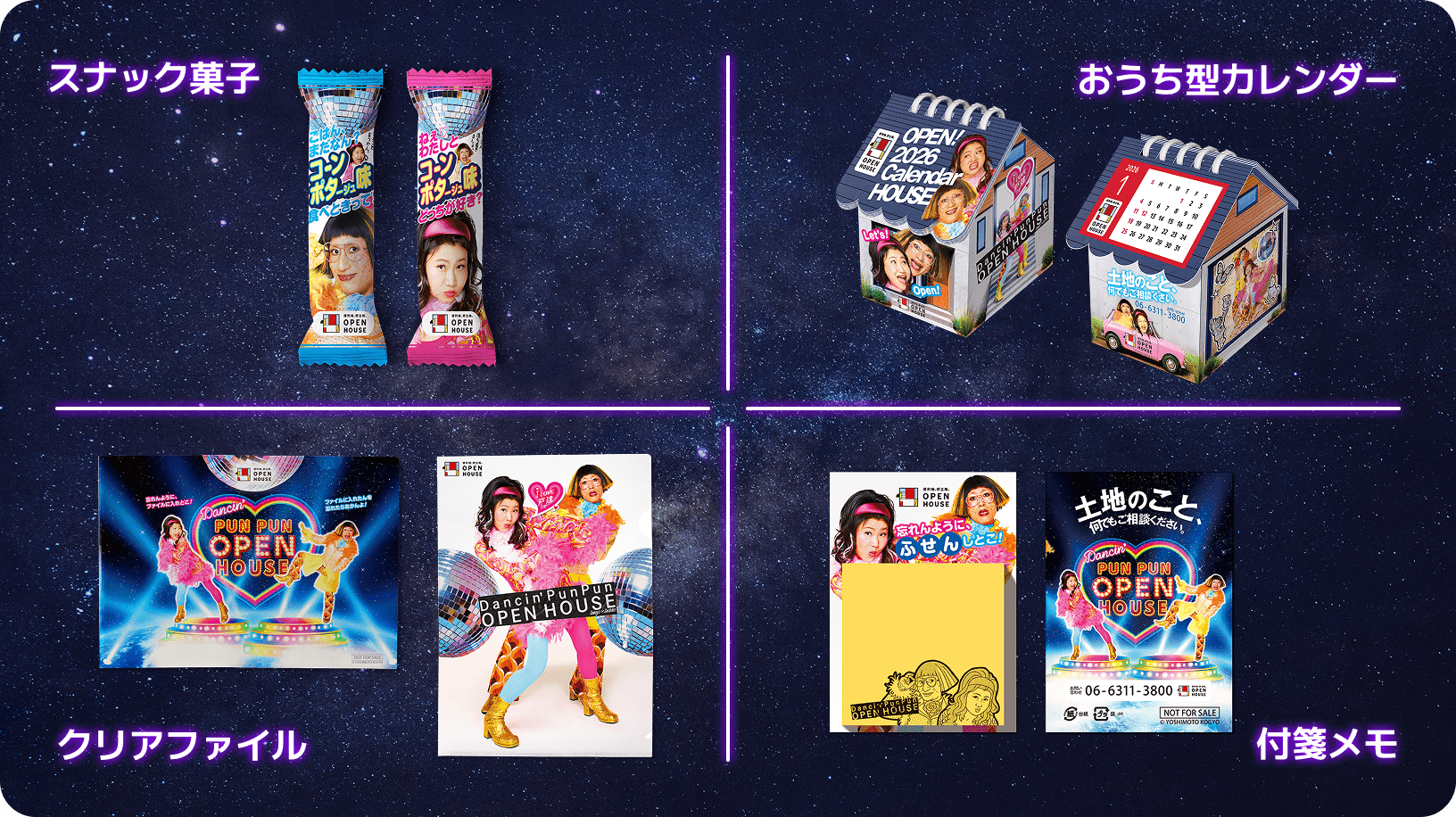 スナック菓子、おうち型カレンダー、クリアファイル、付箋メモ
